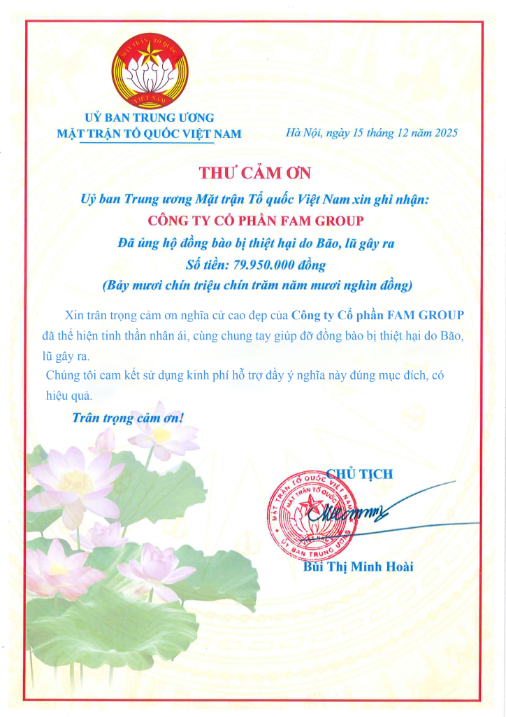 Ngày 15/12/2025, đại diện Ban Lãnh đạo FAM GROUP đã thay mặt doanh nghiệp trực tiếp trao gửi số tiền tới Ủy ban Trung ương Mặt trận Tổ quốc Việt Nam, thể hiện tinh thần trách nhiệm và cam kết đồng hành cùng cộng đồng.